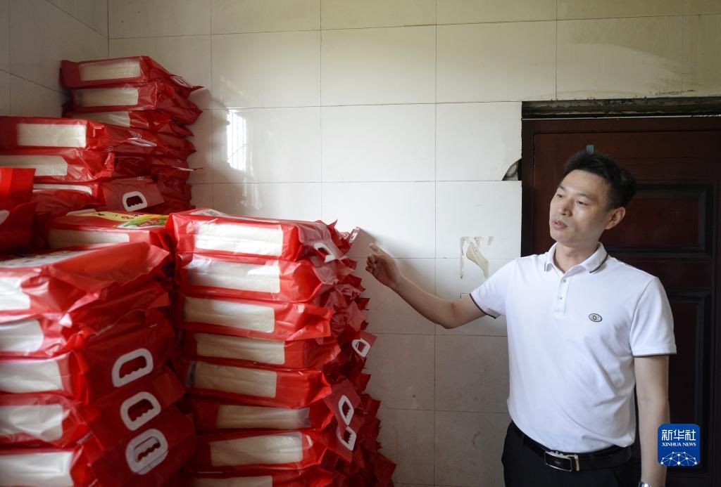 6月7日,四川新万兴碳纤维复合材料有限公司副总经理王斌介绍公司大米储备情况。据王斌介绍,公司在出现疫情后迅速增加原材料、生活物资储备,在夹江县静态管理期间,公司实现300多名员工闭环在岗满负荷生产。 新华社记者 刘坤 摄