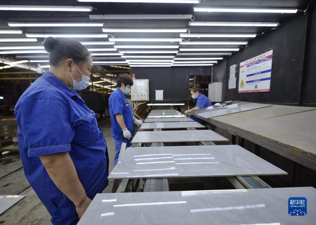 6月7日,索菲亚新型建材有限公司员工检查瓷砖质量。该公司疫情期间停工四天后复工复产。 新华社记者 刘坤 摄